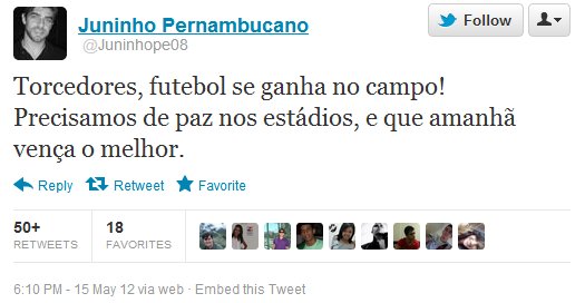 @Juninhope08: Torcedores, futebol se ganha no campo! Precisamos de paz nos estádios, e que amanhã vença o melhor.