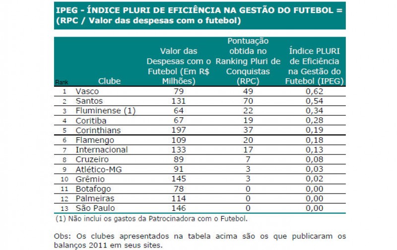 Portanto, não fico surpreso com o resultado desse trabalho da Pluri Consultoria, que chegou à conclusão de terem sido o Vasco da Gama e o Santos os dois clubes mais eficientes do Brasil em 2011, de acordo com o IPEG – Índice Pluri de Eficiência na Gestão do Futebol.