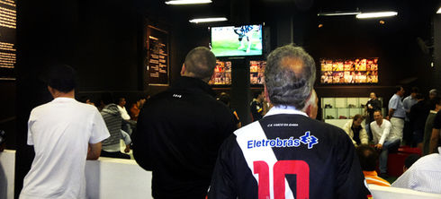 Enquanto a bola não rola para o confronto entre Vasco e Corinthians, pelas quartas de final da Libertadores, na noite desta quarta-feira, os cruz-maltinos que foram ao Setor Premium de São Januário aproveitavam para acompanhar outras partidas. Em uma televisão, Libertad (PAR) x Universidad de Chile (CHI), também pelas quartas de final da competição continental. Já na outra, Atlético-PR x Palmeiras, duelam para avançar às semifinais da Copa do Brasil. (Foto: Rodrigo Ciantar)