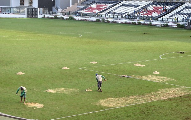 A chuva que caiu nos últimos dias, no Rio de Janeiro, somada à quantidade de treinos, deixou o gramado de São Januário em mau estado. E após a partida entre Vasco e Corinthians, pelas quartas de final da Libertadores, disputada sob muita água na última quarta-feira, deixou a situação ainda pior. Por isso, na tarde desta quinta, o clube intensificou o trabalho para recuperar o piso, já que neste domingo a equipe cruz-maltina volta ao seu estádio para enfrentar o Grêmio, pela primeira rodada do Campeonato Brasileiro.