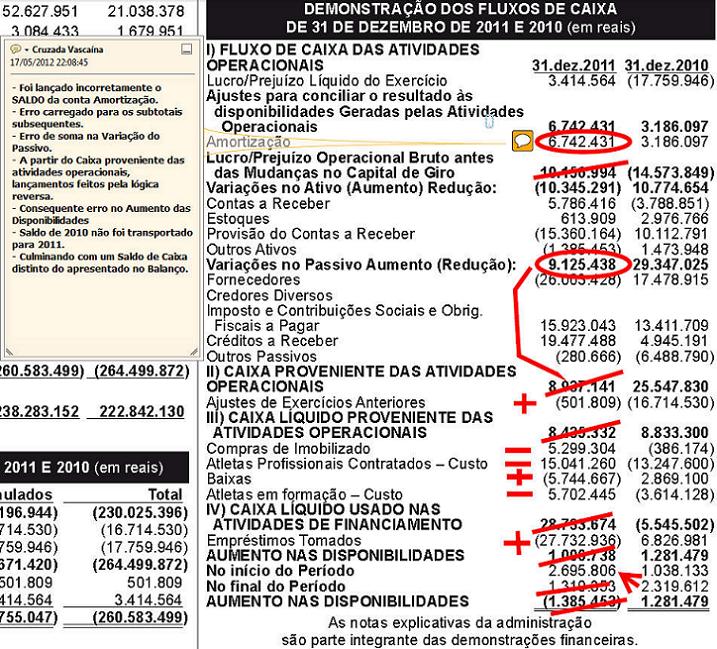 A Comissão de Finanças da Cruzada Vascaína identificou erros de soma; erros de sinal; valores de contas trocados; valores onde deveria ser apresentada apenas a diferença com o ano anterior, mas, foi apresentado o resultado; e, outros erros mais que provocaram uma quantidade absurda de dados incoerentes no fluxo de caixa. Todos esses erros nos levaram a questionar, também, a credibilidade dos demais dados apresentados. As informações presentes no fluxo de caixa devem ser uma consequência do ativo e do passivo. Entretanto, como esses valores hoje não batem, fica impossível garantir que os números lançados no ativo e no passivo estejam corretos.