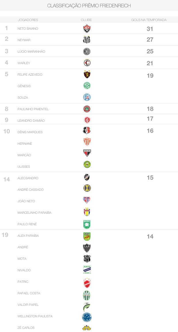 Fim dos estaduais, reta final de Copa do Brasil e Libertadores e artilheiros de mal com o gol. Dos que entraram em campo neste meio de semana, nenhum novo atleta chegou a 14 gols e entrou no ranking ou aumentou a conta na atual lista. Foram os casos de Neto Baiano e Neymar, líder e vice-líder do Prêmio Artilheiro do Ano - que lista os goleadores da temporada no futebol brasileiro e dará ao vencedor o troféu Friedenreich. Resultado: nem Vitória nem Santos saíram do zero no empate contra Coritiba (0 a 0) e na derrota para o Vélez (1 a 0), respectivamente.
