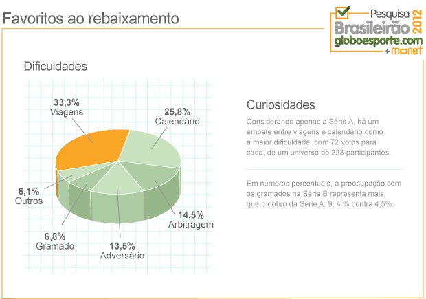 Logo atrás, com 25,8%, aparece o calendário, seguido por arbitragem, adversário e gramado. Há ainda outras adversidades, que totalizam 6,1%. A pesquisa foi realizada pelo GLOBOESPORTE.COM em parceria com a revista “Monet”, com 334 jogadores, de 23 equipes do futebol brasileiro.