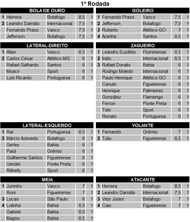 Raí, da Lusa, e Márcio Azevedo, do Botafogo, tiveram atuação um pouco melhor que os seus concorrentes, mas suficiente para liderar a primeira semana da Bola de Prata. Abaixo deles, cinco empatados.