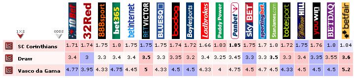 Veja abaixo uma tabela com a comparação entre as cotações das principais casas de apostas do exterior para Corinthians x Vasco: