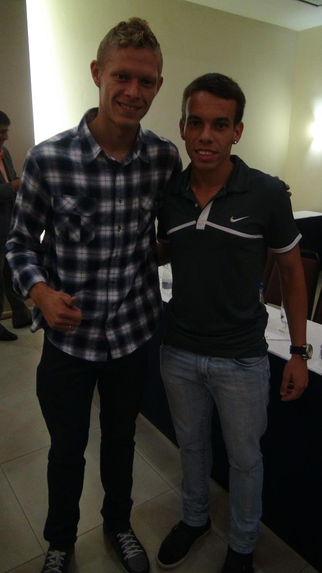 ![]() Felipe posa ao lado de ex-jogadores e dos organizadores do evento | ![]() Marlone e Marquinhos, ambos dos Juniores, marcam presença no evento |