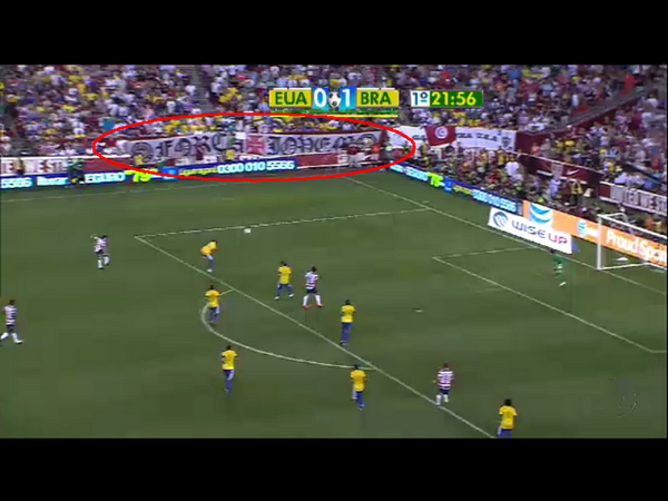 Na transmissão de Estados Unidos x Vasco, chama atenção a presença de uma bandeira da Força Jovem Vasco, torcida organizada do Gigante da Colina.