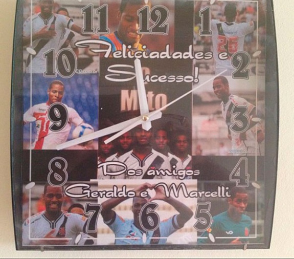 Os amigos personalizaram um relógio de parede com fotos do jogador em diversas fases dele com a camisa vascaína e desejando felicidades e sucesso na carreira.