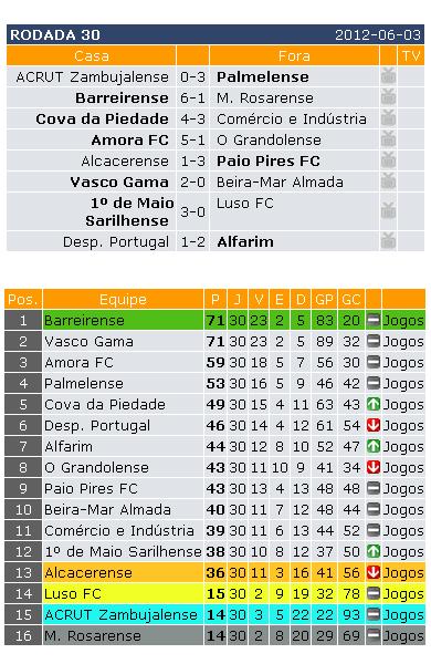 Acabou neste domingo (03/06) o campeonato da 1ª Divisão da Associação de Futebol de Setúbal, que corresponde à 5ª divisão do futebol português. O Vasco da Gama de Sines - que tem um convênio com o C.R. Vasco da Gama - terminou na 2ª colocação, empatado em pontos com o Barreirense, que ficou com o título devido ao critério de desempate do confronto direto. Desta forma, o Vasco de Sines não conseguiu alcançar seu objetivo de ser promovido para a 4ª divisão portuguesa, oficialmente denominada "III Divisão Nacional".