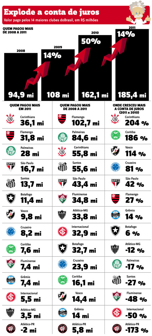 Em três anos, de 2008 a 2011, a conta financeira dos clubes de futebol cresceu 95%, numa taxa média de 25% ao ano. Nesse ritmo, os clubes estarão pagando mais de R$ 1 bilhão (dois estádios) de juros em 2014.