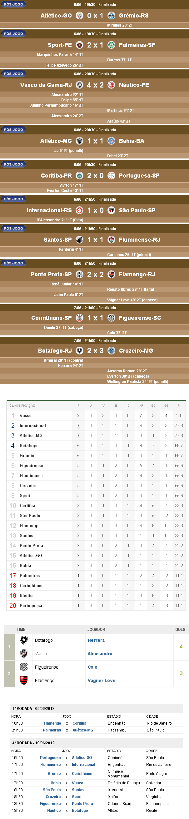 Terminada a 3ª rodada do Campeonato Brasileiro 2012, o Vasco, que derrotou o Náutico por 4 a 2, subiu da 2ª para a 1ª colocação na tabela e está 2 pontos à frente do vice-líder Internacional. O Gigante da Colina está pela 3ª rodada seguida dentro da zona de classificação à Copa Libertadores da América.