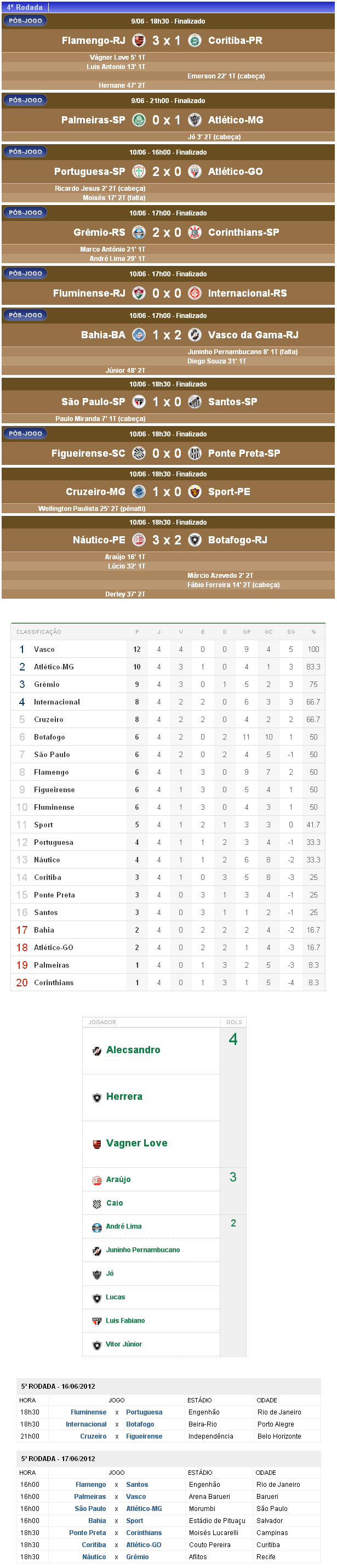 Terminada a 4ª rodada do Campeonato Brasileiro 2012, o Vasco, que derrotou o Bahia por 2 a 1, manteve-se na 1ª colocação na tabela e está 2 pontos à frente do vice-líder Atlético-MG. O Gigante da Colina está pela 4ª rodada seguida dentro da zona de classificação à Copa Libertadores da América.