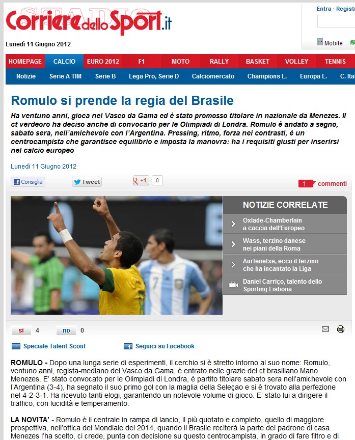 Nesta segunda-feira (11/06), o portal ‘Corriere Dello Sport’, um dos mais importantes da Itália, elaborou um especial sobre o jogador e chegou a colocá-lo numa patamar acima de Lucas (Liverpool), Ralf (Corinthians), Fernandinho (Shakthar) e Luiz Gustavo (Bayern), que chegaram a ser titulares ao longo da trajetória de Mano Menezes na Seleção.