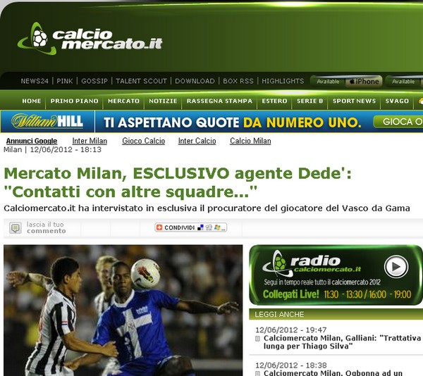 Em entrevista ao site Calciomercato.it, o empresário do zagueiro Dedé, Giuliano Aranda, comentou as especulações do interesse de Milan e Barcelona no "Mito" do Vasco.