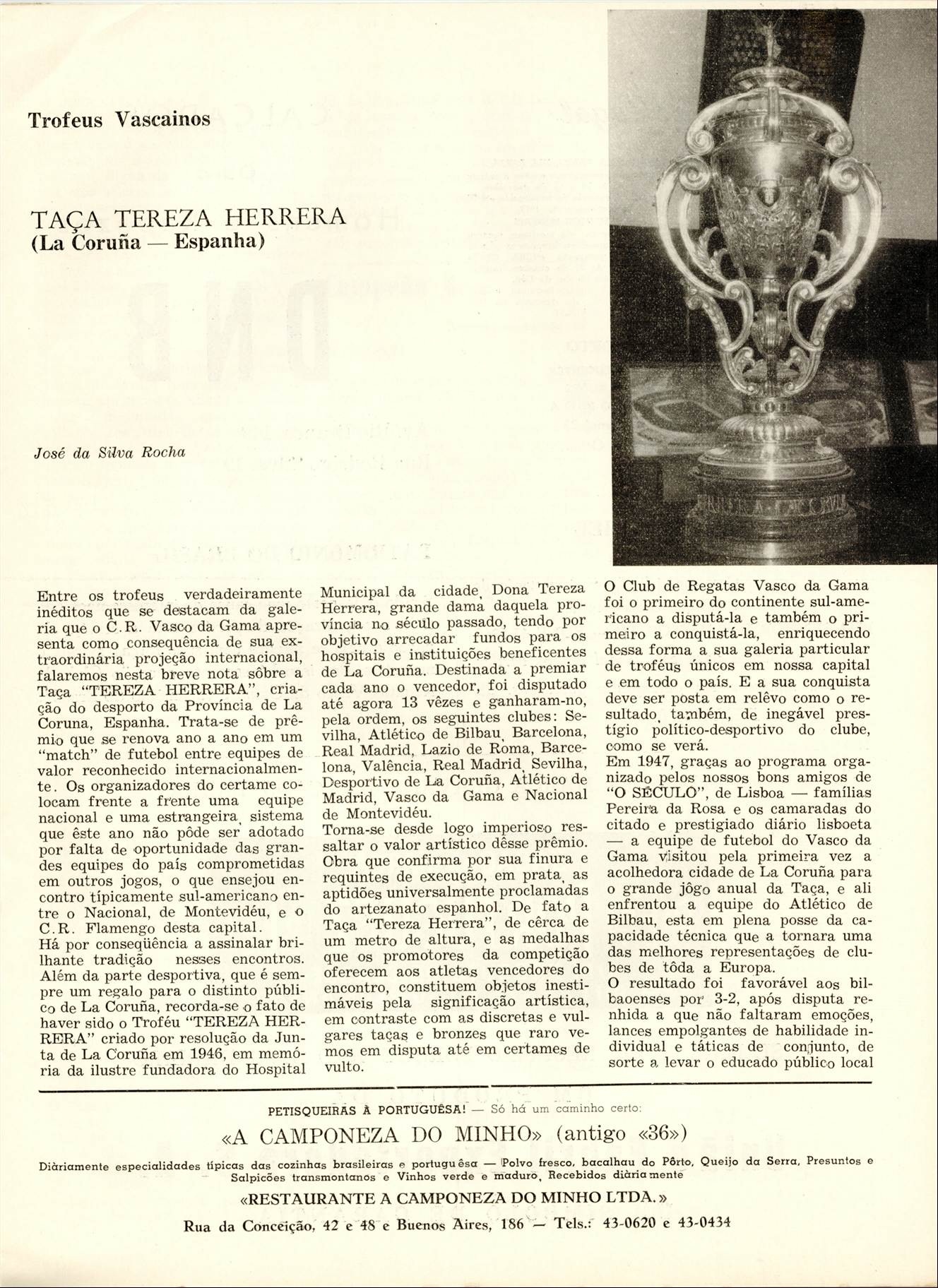 No dia 16/06/1957, o Vasco vencia o Athletic de Bilbao da Espanha na Cidade de La Coruña (Espanha) por 4 x 2 e sagrava-se Campeão do Troféu Tereza Herrera, dois dias após ter sido Campeão do Torneio de Paris.