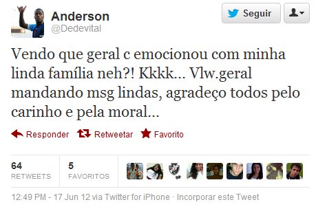 @Dedevital: Vendo que geral c emocionou com minha linda família neh?! Kkkk... Vlw.geral mandando msg lindas, agradeço todos pelo carinho e pela moral...