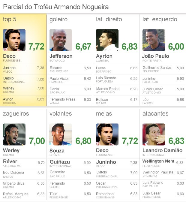 O meia Deco, do Fluminense, ainda lidera a parcial com média de 7,72 pontos. Com outra bela atuação do camisa 20, o Tricolor goleou o Atlético-GO, fora de casa, por 4 a 1. O maestro tricolor fez um gol de pênalti e fez uma assistência, que ajudaram a sua equipe a sair de campo com o triunfo. Na segunda colocação, aparece Juninho Pernambucano, do Vasco. Mesmo sem atuar na derrota para o Cruzeiro por 3 a 0, o meia cruz-maltino, que participou de quatro partidas, manteve a alta média, com 7,38. Na terceira posição vem Werley, do Grêmio, e Dátolo, do Internacional, ambos com média 7. O Top 5 do Brasileirão após cinco rodadas é completado por Ayrton, do Coritiba, e Leandro Damião, do Internacional, ambos com média 7