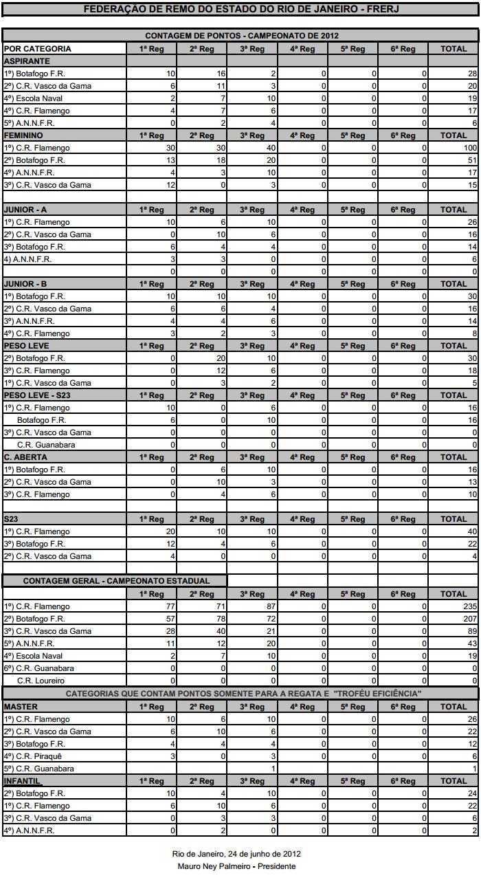 FOI APROVADA, PELA COMISSÃO DE ARBITRAGEM, A 3ª REGATA DO CAMPEONATO ESTADUAL, REALIZADA NO DIA 24 DE JUNHO DE 2012, NA LAGOA RODRIGO DE FREITAS CUJO RESULTADO FOI O SEGUINTE: