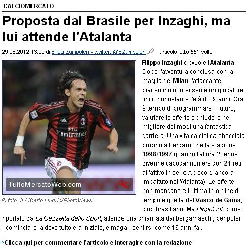 Segundo reportagem do site Tuttoatalanta, o atacante Inzaghi teria recebido proposta do Vasco da Gama, mas gostaria de encerrar a carreira na Atalanta clube em que foi artilheiro na temporada 1996/97, quando marcou 24 gols e foi artilheiro da série A, e estaria apenas aguardando um telefonema para voltar a jogar na cidade de Bérgamo.