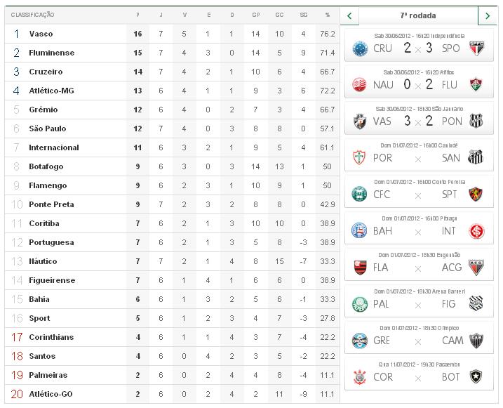 A vitória sobre a Ponte Preta por 3 a 2 recolocou o Vasco na liderança do Brasileirão. O único time que pode tirar o Gigante da Colina do topo da tabela ainda na 7ª rodada é o Atlético Mineiro, que enfrenta o Grêmio fora de casa no domingo (01/07). Só uma vitória fará o Galo desbancar o Vasco.