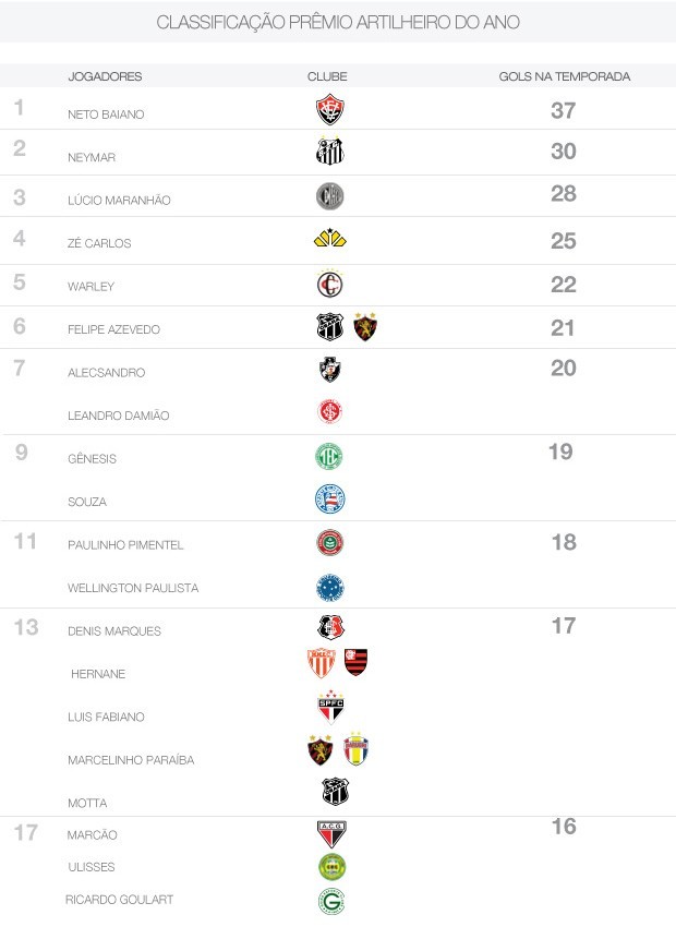 Folgado na liderança desta disputa com 37 gols na temporada, Neto Baiano também passou em branco, mas mesmo sem a colaboração do seu goleador, o Vitória derrotou o ABC por 1 a 0, no Frasqueirão. A novidade na lista de artilheiros é a presença de Ricardo Goulart, do Goiás, com 16 gols.