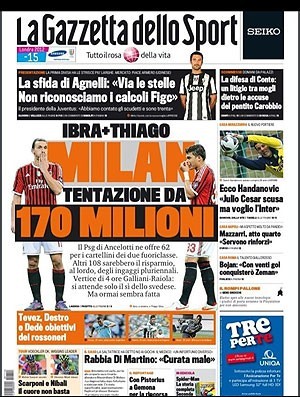 Ainda de acordo com o jornal “La Gazzetta Dello Sport”, o Milan estaria tentado a aceitar a oferta pois, além do valor que receberá pelos direitos federativos da dupla, também economizaria € 108 milhões em salários (por isso o título “tentação de 170 milhões”, em italiano, na capa da edição de quinta-feira do diário – foto acima).