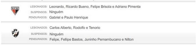 Confira os lesionados, suspensos e pendurados de Vasco e Atlético-GO
