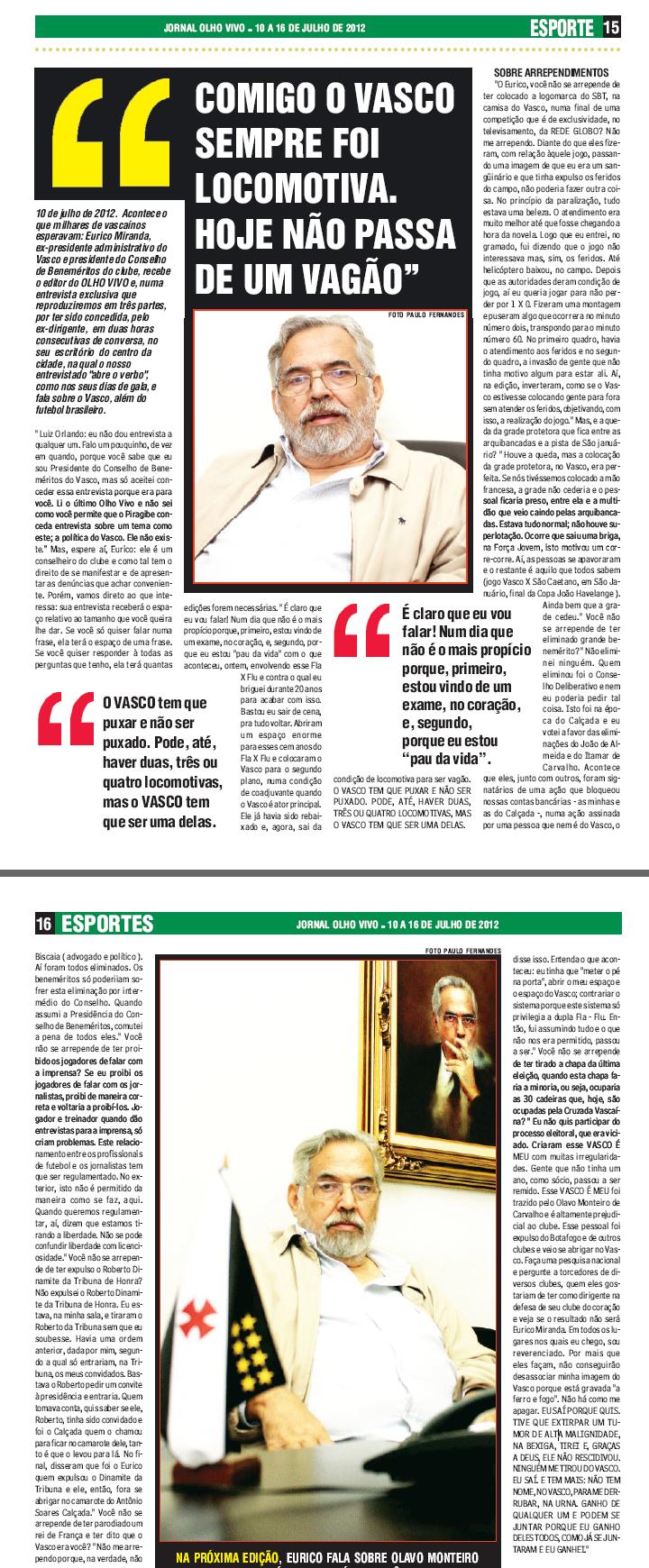 10 de julho de 2012. Acontece o que milhares de vascaínos esperavam: Eurico Miranda, ex-presidente administrativo do Vasco e presidente do Conselho de Beneméritos do clube, recebe o editor do OLHO VIVO e, numa entrevista exclusiva que reproduziremos em três partes, por ter sido concedida, pelo ex-dirigente, em duas horas consecutivas de conversa, no seu escritório do centro da cidade, na qual o nosso entrevistado "abre o verbo", como nos seus dias de gala, e fala sobre o Vasco, além do futebol brasileiro.