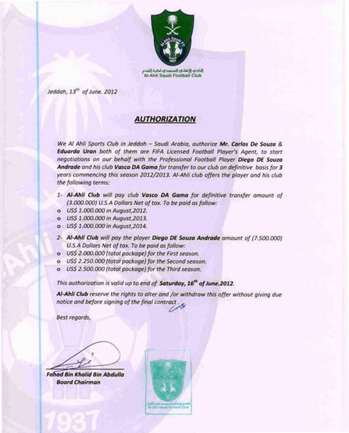 Na manhã deste sábado, a reportagem do LANCE! teve acesso às duas propostas dos clubes árabes feitas ao apoiador Diego Souza.