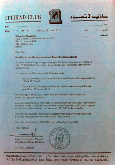 O interesse do Al-Ittihad surgiu depois. Mas a proposta foi mais alta. De acordo com o documento assinado pelo presidente do clube árabe, foram oferecidos ao Gigante da Colina 5 milhões de euros (cerca de R$ 12 milhões), que seriam pagos em duas parcelas de 2,5 milhões de euros (cerca de R$ 6 milhões) em agosto de cada ano. No entanto, diferentemente do rival, o Al-Ittihad não ofereceu valores exclusivos ao atleta.