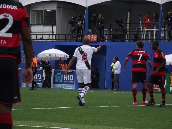 No último jogo pela segunda fase da Liga Fut 7, neste domingo (15/07), na Arena Sapucaí, o Flamengo goleou o Vasco por 6 a 1. Mesmo com a expressiva vitória o time não avançou para as semifinais da competição, pois perdeu os dois primeiros jogos. Athirson, ex-jogador de campo do Fla, foi a estrela do time. Já pelo Vasco, atuou Viola, também ex-jogador de campo.