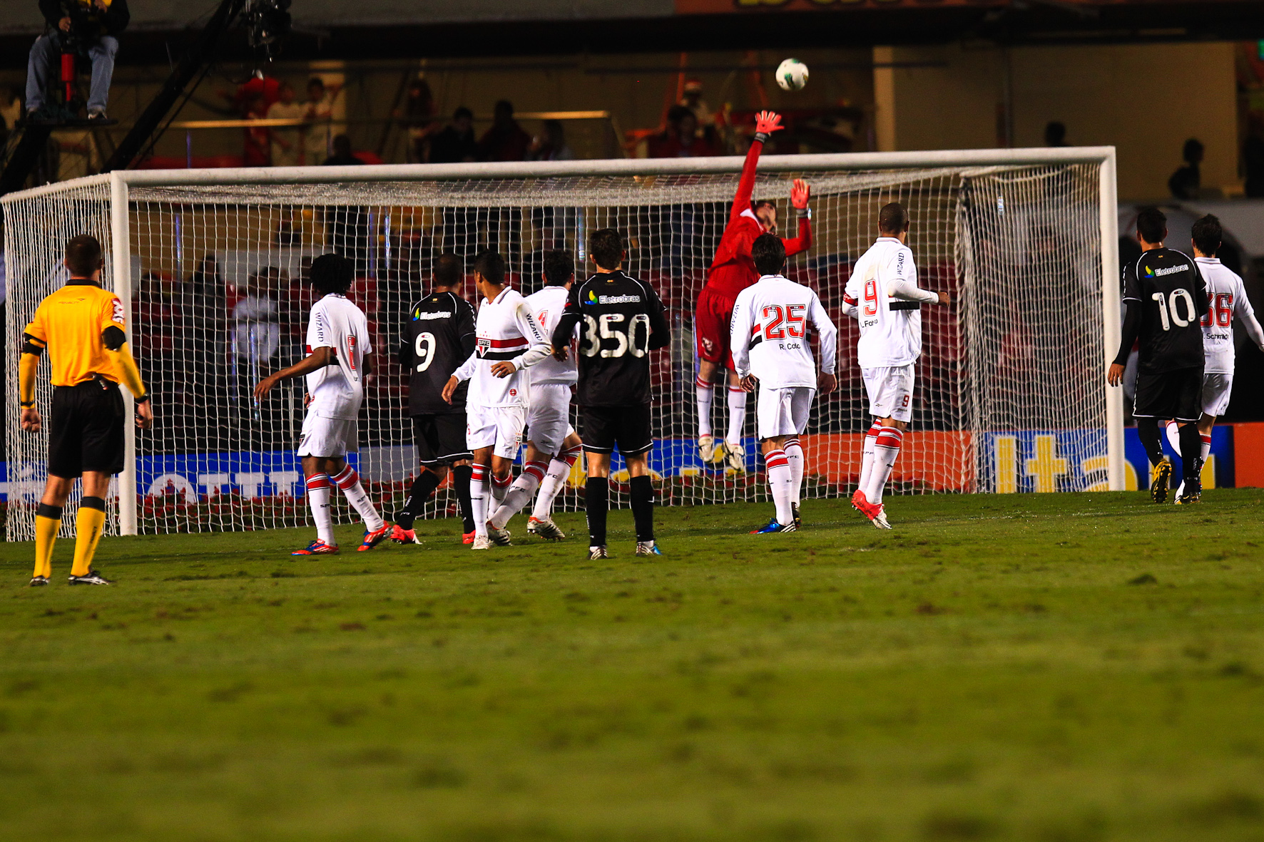 Até o apito para o intervalo de Leandro Vuaden, pode-se dizer que o Tricolor teve muita sorte em sair do gramado com a igualdade no marcador. Em duas faltas, Juninho Pernambucano levou Denis ao desespero. Na primeira, o goleiro fez bela defesa. Na segunda, a bola foi no travessão. O veterano da Colina, que completava seu jogo de número 350, ainda levou perigo em chute de fora da área, novamente defendida pelo goleiro são-paulino.