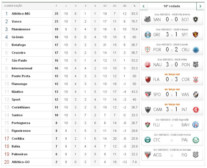 Os resultados dos 3 jogos da 5ª-feira (19/07) não alterarão as 12 primeiras colocações do Campeonato Brasileiro. O Atlético Mineiro segue líder, com o Vasco em 2º lugar 2 pontos atrás e o Fluminense na 3ª posição.