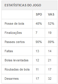 Juninho também se destacou em outros dois quesitos: nos passes (acertou 45 de 49, um índice de 92%) e nas bolas levantadas (12). Nas estatísticas coletivas, o Vasco mostrou bom poder de marcação ao roubar 17 bolas e desarmar 32 vezes (o São Paulo conseguiu 11 e 17, respectivamente). A diferença entre um quesito e outro é que no desarme o jogador não fica com a bola dominada após tirá-la do adversário.
