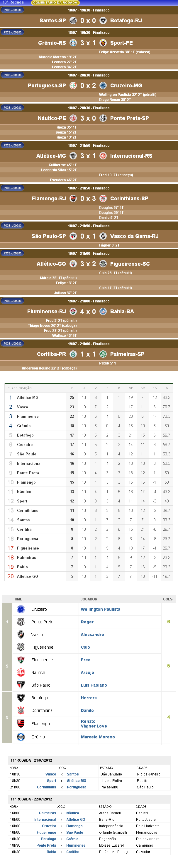 Terminada a 10ª rodada do Campeonato Brasileiro 2012, o Vasco, que derrotou o São Paulo por 1 a 0, manteve-se na 2ª colocação na tabela e 2 pontos atrás do líder Atlético-MG. O Gigante da Colina está pela 10ª rodada seguida dentro da zona de classificação à Copa Libertadores da América.