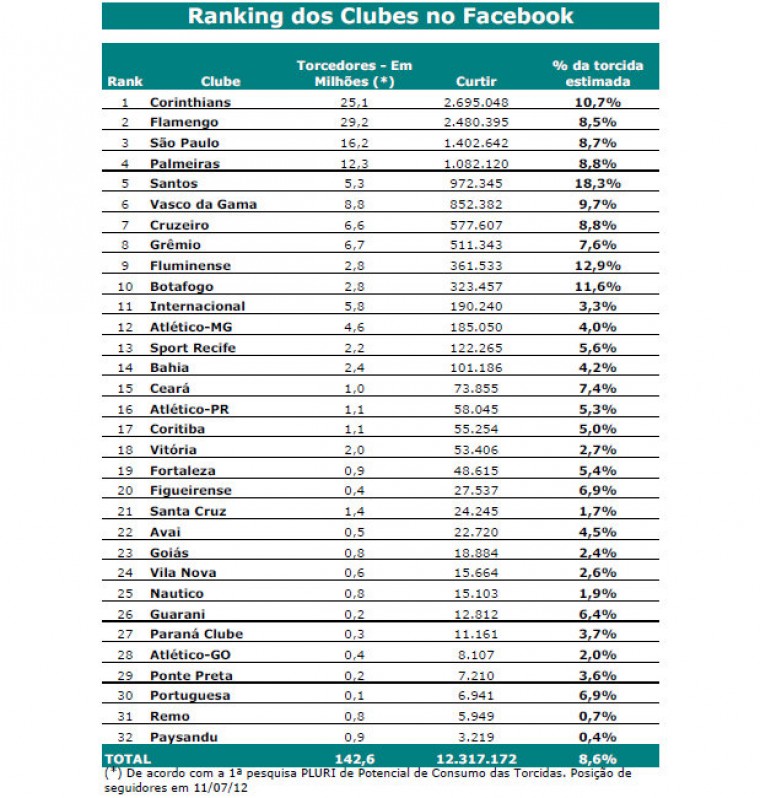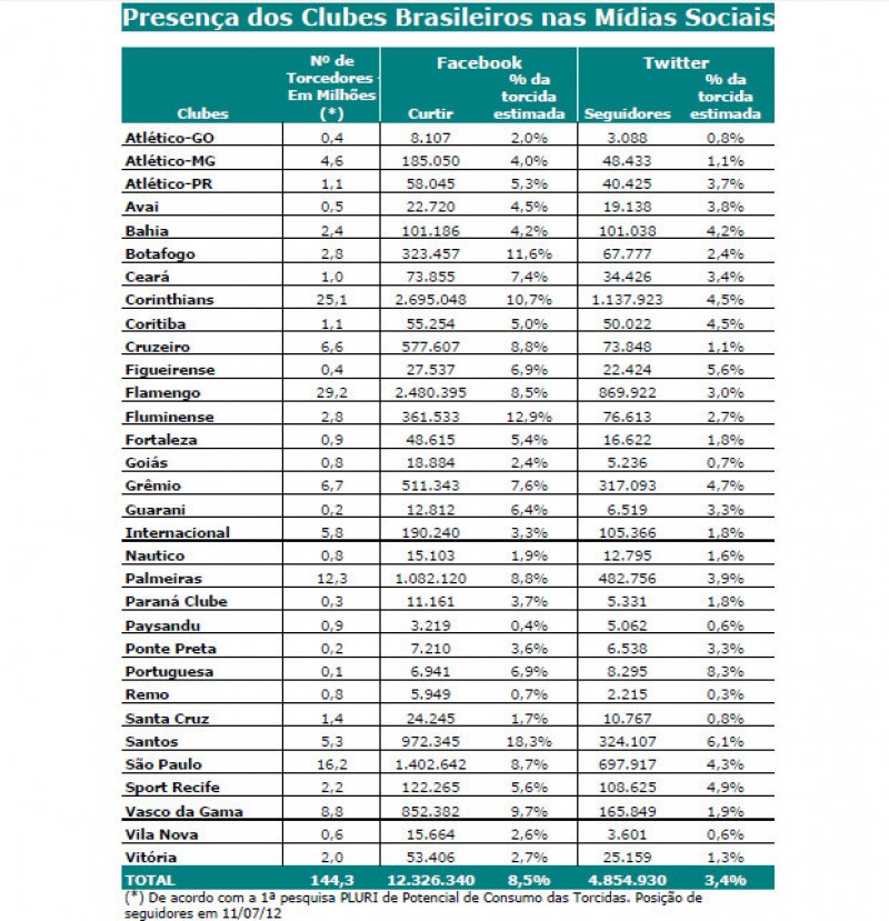A última pesquisa PLURI de Potencial de consumo das torcidas, divulgada em março nos deu um bom parâmetro para avaliação do tamanho de cada torcida, sua renda e capacidade de consumo. Porém, levando em consideração o número de torcedores de cada clube e a sua respectiva quantidade de seguidores, verificamos que a maioria dos 32 clubes de maior torcida estão subutilizando o potencial de comunicação, motivação e conversão em consumo das redes sociais.