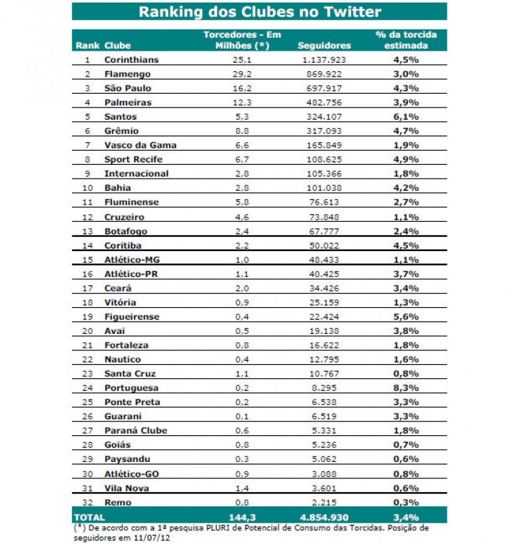 Podemos verificar que o twitter ainda não deslanchou como uma ferramenta de comunicação e interação dos clubes com seus torcedores(as). A média dos clubes brasileiros é um pouco maior que 3% de seguidores nos 32 clubes de maior torcida, sendo que para 6 desses clubes não atinge sequer 1% de seus torcedores. Mesmo os clubes de SP-RJ-MG-RS-PR, com toda sua história, títulos, quantidade de torcedores e poder econômico não estão conseguindo esenvolver ações de marketing efetivas através da utilização destas novas ferramentas, salvo raras exceções.
