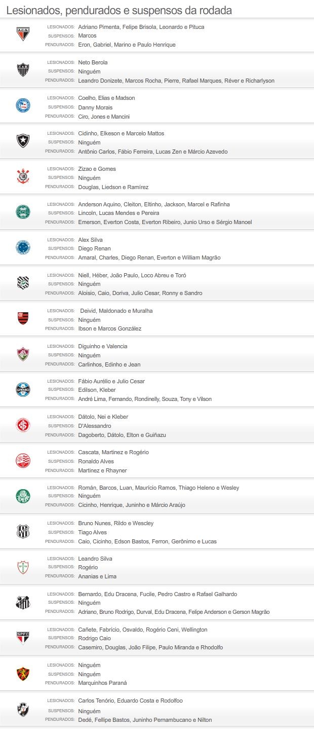 Confira a lista completa de lesionados, suspensos e pendurados para a 11ª rodada: