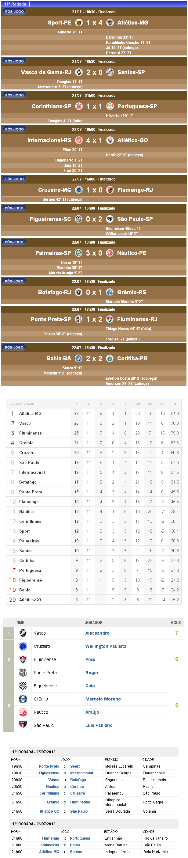 Terminada a 11ª rodada do Campeonato Brasileiro 2012, o Vasco, que derrotou o Santos por 2 a 0, manteve-se na 2ª colocação na tabela e 2 pontos atrás do líder Atlético-MG. O Gigante da Colina está pela 11ª rodada seguida dentro da zona de classificação à Copa Libertadores da América.