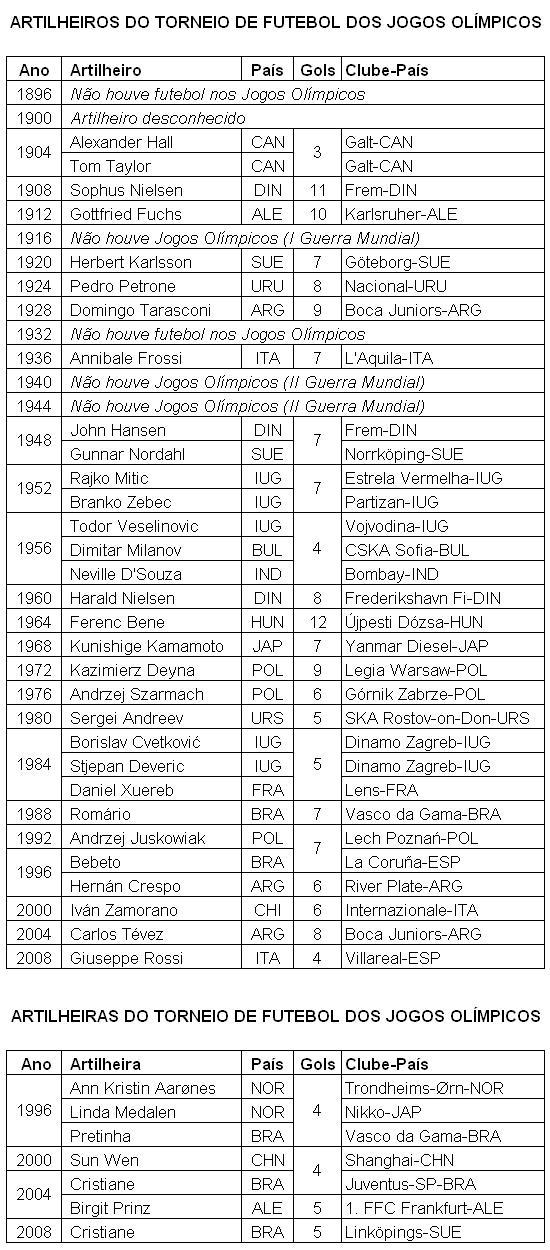 Os torneios feminino e masculino de futebol das Olimpíadas de Londres começam respectivamente na 4ª (25/07) e na 5ª-feira (26/07) desta semana, antes mesmo da abertura oficial dos Jogos. O Vasco se fará representar, na competição masculina, pelo volante Romulo. Trata-se, portanto, de uma ótima ocasião para relembrar mais uma glória vascaína que, em meio a tantas, acaba passando quase despercebida: o Vasco da Gama é o único clube no mundo a ter artilheiros olímpicos tanto no futebol masculino quanto no feminino. Em Seul-1988, Romário balançou as redes 7 vezes e terminou a competição como seu goleador máximo. Oito anos depois, em Atlanta-1996, quando o futebol feminino fazia sua estreia nos Jogos Olímpicos, a vascaína Pretinha (Delma Gonçalves) marcou 4 gols e dividiu a artilharia com duas norueguesas. A relação abaixo, compilada pela NETVASCO tendo como base a Wikipédia e a RSSSF, traz todos os artilheiros olímpicos e seus respectivos clubes: