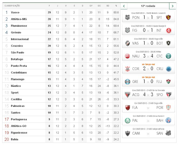 Com a vitória sobre o Botafogo, o Vasco chegou à liderança provisória do Brasileirão e só deixará o topo da tabela na 12ª rodada se o Atlético-MG pontuar contra o Santos nesta 5ª-feira (26/07), em Belo Horizonte.