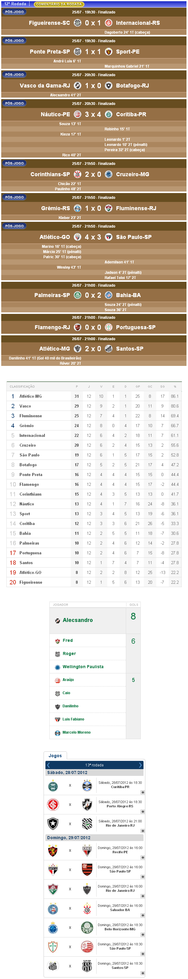Terminada a 12ª rodada do Campeonato Brasileiro 2012, o Vasco, que derrotou o Botafogo por 1 a 0, manteve-se na 2ª colocação na tabela e 2 pontos atrás do líder Atlético-MG. O Gigante da Colina está pela 12ª rodada seguida dentro da zona de classificação à Copa Libertadores da América.