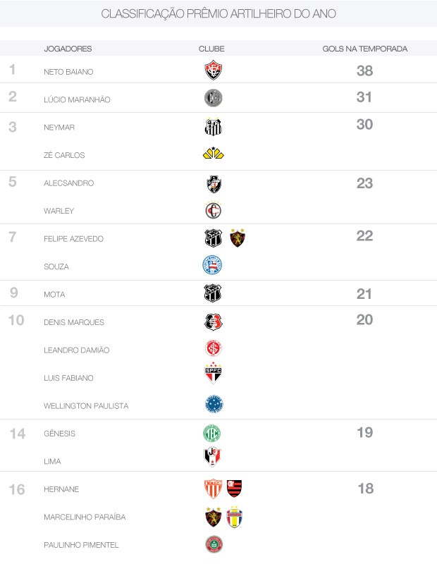 Depois que realizar seu último jogo com a camisa do time baiano, o que acontecerá nesta terça-feira, contra o São Caetano, a tarefa de Neto Baiano será secar seus adversários para seguir na ponta até o fim do ano. O problema é que na Segunda Divisão dois jogadores não param de diminuir a diferença. Zé Carlos, por exemplo, fez dois na goleada do Criciúma por 4 a 1 sobre o Barueri, chegou a 16 na Série B, empatou com Neymar no ranking geral e fica perto do topo. Viu ainda Lúcio Maranhão passar em branco na derrota do ASA para o Goiás e estacionar nos 31 gols, um mais que Zé Carlos.