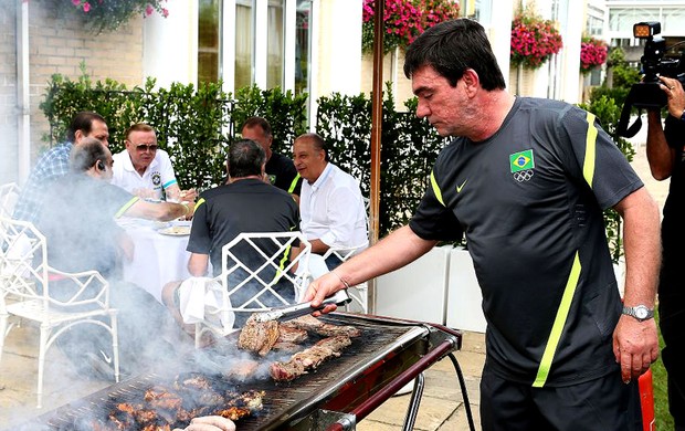 Após quatro horas de viagem de Manchester a St. Albans, a seleção brasileira ganhou um mimo na tarde desta quarta-feira, na concentração, localizada a 45 km de Londres. Com o diretor de Seleções da CBF, Andrés Sanches, ajudando a cuidar da churrasqueira, os jogadores puderam ter um almoço de confraternização a três dias da final do torneio masculino de futebol, no sábado, às 11h (de Brasília), contra o México, em Wembley. O presidente José Maria Marin também participou do encontro.
