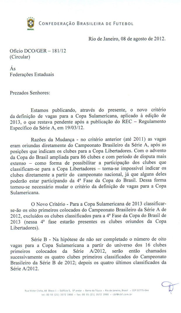 Vale lembrar que os clubes participantes da Libertadores de 2013 estão automaticamente classificados para a quarta fase da Copa do Brasil.