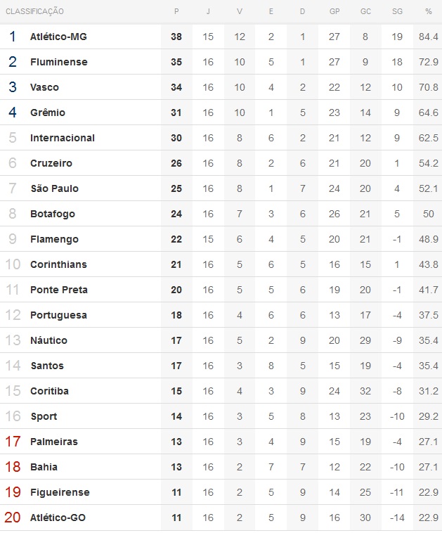 Terminada a 16ª rodada do Campeonato Brasileiro 2012, o Vasco, que perdeu para o Atlético Mineiro 1 a 0, caiu da 2ª para a 3ª colocação e está agora 1 ponto atrás do vice-líder Fluminense e 4 atrás do líder Atlético Mineiro, que tem um jogo a menos que seus perseguidores diretos. O Gigante da Colina está pela 16ª rodada seguida dentro da zona de classificação à Copa Libertadores da América.