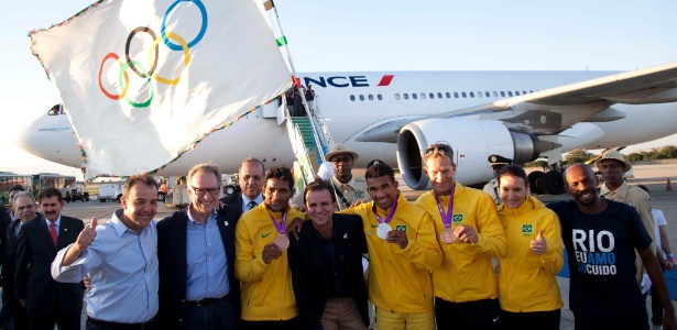 Na chegada da bandeira ao Rio, o prefeito esteve acompanhado do governador Sergio Cabral. Cabral falou sobre a “transformação” do Rio para 2016 e agradeceu ao presidente do Comitê Olímpico Brasileiro (COB), Carlos Nuzman, à presidente Dilma Rousseff, e ao ex-presidente Luiz Inácio Lula da Silva. “Tive a oportunidade de falar com ele [Lula] ontem por telefone e agradecer pela sua dedicação ao projeto”, afirmou Cabral.