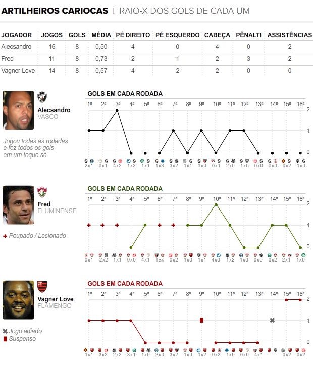 Em 42 disputas, o Rio registrou 17 artilheiros, mais do que qualquer outro estado. O Vasco tem oito, com destaque para Romário (três vezes) e Roberto Dinamite (duas); o Flamengo, quatro, sendo três com Zico; Fluminense e Botafogo, dois cada; e América, um. Nesta temporada, o trio goleador já passou por jejum e tem média inferior, por exemplo, à que conseguiu o então santista Borges no ano passado (0,74). Fred é quem mais se aproxima do número, com 0,73. Love tem 0,56, e Alecsandro, 0,5, estatística que ele crê ser suficiente para brigar até o fim.