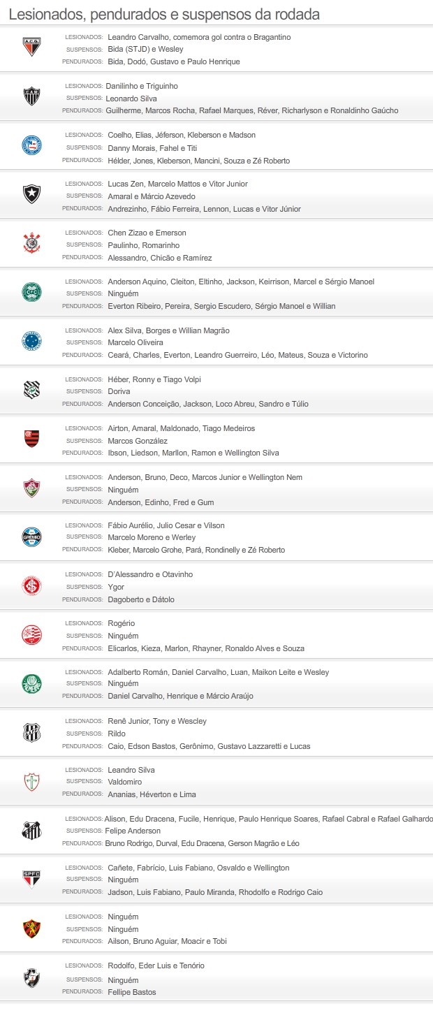 Completo, o Sport vai ao Rio de Janeiro enfrentar o Botafogo, desfalcado de três titulares: Márcio Azevedo e Amaral estão suspensos, além de Vitor Júnior, que sentiu dores musculares e foi vetado. Destaque na última rodada, Romarinho desfalca o Corinthians, já que recebeu o terceiro amarelo. O Internacional, por sua vez, não contará com Ygor, pelo mesmo motivo. A boa notícia fica por conta da volta de Dátolo, que estava lesionado.