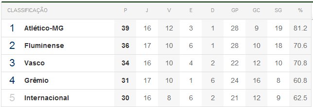 Se vencer o Coritiba nesta quinta-feira, o Vasco ultrapassa o Fluminense e volta a encostar no Atlético com 2 pontos de diferença. Confira a classificação parcial da rodada: